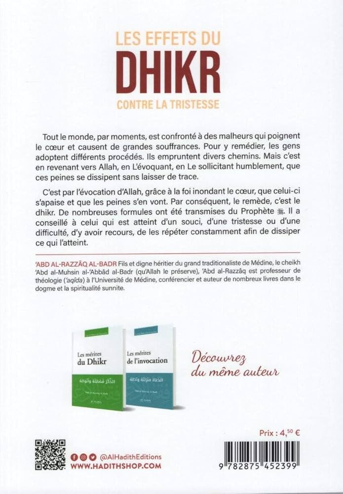 C’est par l’évocation d’Allah, grâce à la foi inondant le cœur, que celui-ci s’apaise et que les peines s’en vont. Par conséquent, le remède, c’est le dhikr. De nombreuses formules ont été transmises du Prophète r. Il a conseillé à celui qui est atteint d’un souci, d’une tristesse ou d’une difficulté, d’y avoir recours, de les répéter constamment afin de dissiper ce qui l’atteint.