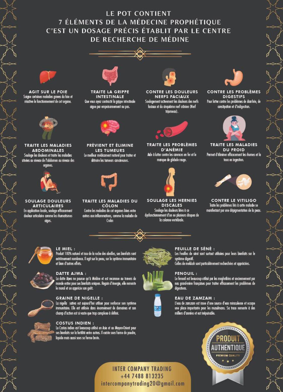Le Pot Kanz Shifae 7 Guérisons a été élaboré par un célèbre centre de recherche Saoudien, situé à Médine, et bénéficie de nombreux cas cliniques qui ont prouvé son efficacité dans de nombreux domaines.